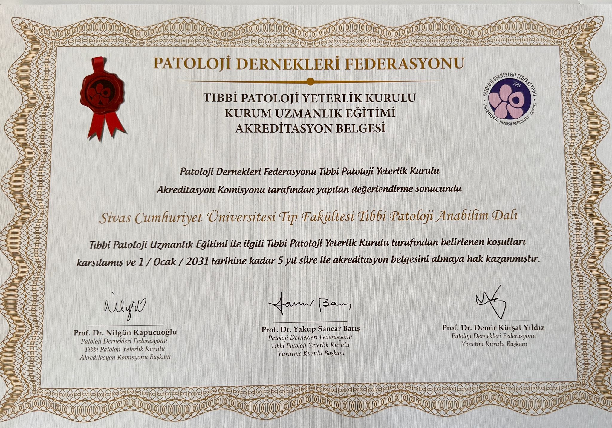 Sivas Cumhuriyet Üniversitesi Tıp Fakültesi Tıbbi Patoloji Anabilim Dalı, Patoloji Dernekleri Federasyonu Tıbbi Patoloji Yeterlik Kurulu tarafından gerçekleştirilen değerlendirme sonucunda yeniden akredite edilmişti. Bu önemli sürecin ardından akreditasyon belgesi, düzenlenen törenle Anabilim Dalı’na resmî olarak takdim edildi.