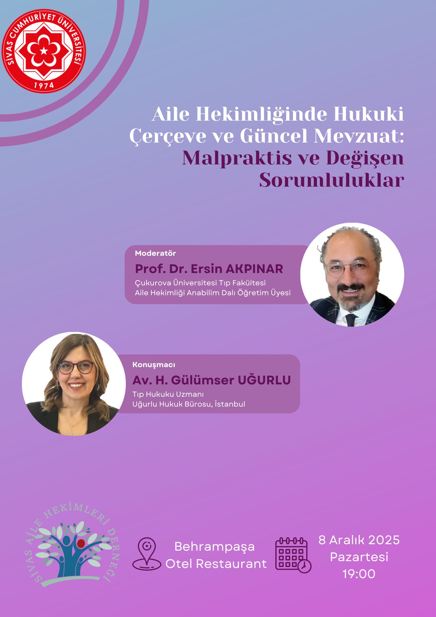 Sivas Aile Hekimleri Derneği ile Sivas Cumhuriyet Üniversitesi Tıp Fakültesi Aile Hekimliği Anabilim Dalı iş birliğinde, aile hekimlerinin mesleki uygulamalarda karşılaştığı hukuki süreçlere ışık tutmak amacıyla “Aile Hekimliğinde Hukuki Çerçeve ve Güncel Mevzuat: Malpraktis ve Değişen Sorumluluklar” başlıklı eğitim toplantısı düzenlenecektir.