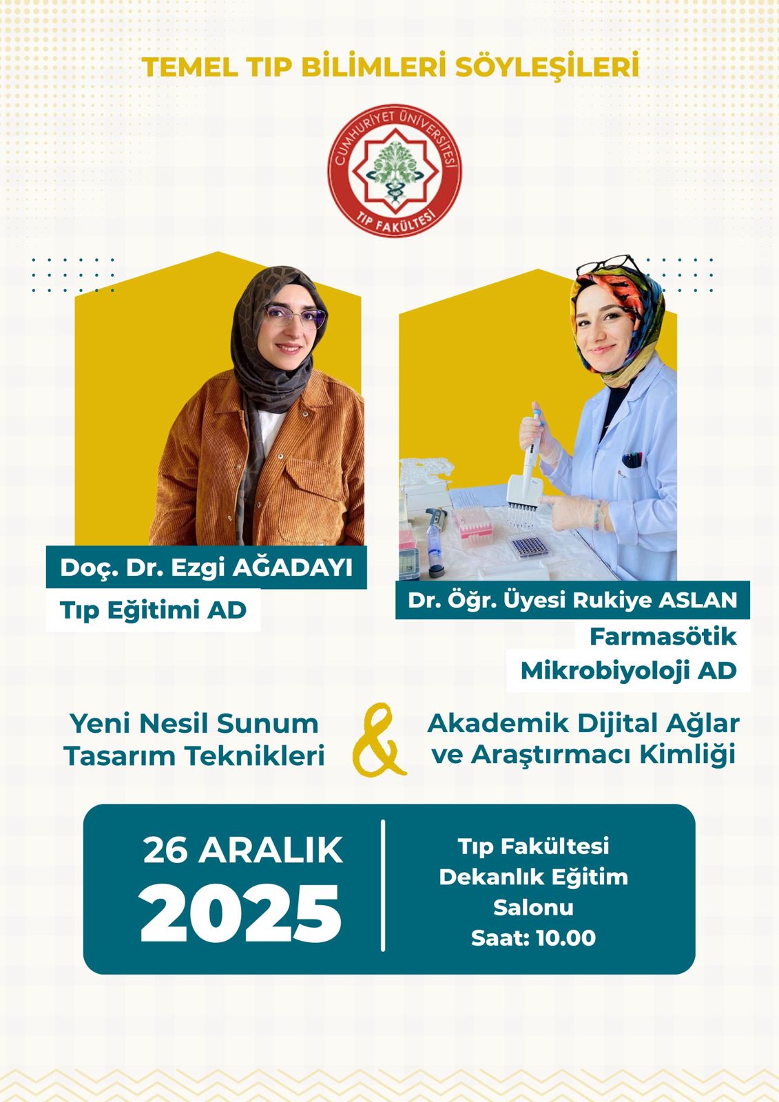 Cumhuriyet Üniversitesi Tıp Fakültesi tarafından düzenlenen “Temel Tıp Bilimleri Söyleşileri”, akademik gelişimi destekleyen güncel ve ilham verici içerikleriyle katılımcılarını bekliyor.