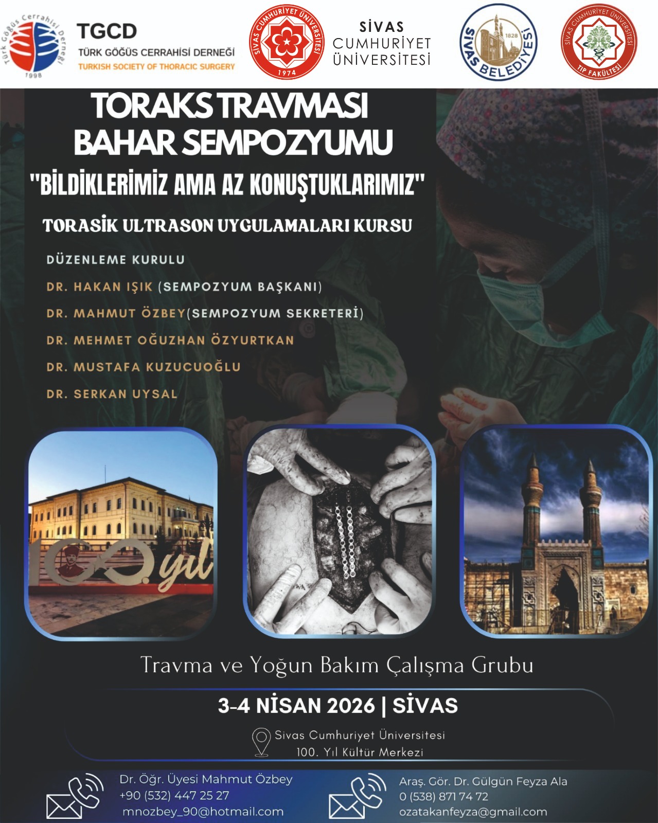 Türk Göğüs Cerrahisi Derneği Travma ve Yoğun Bakım Çalışma Grubu öncülüğünde ve Sivas Cumhuriyet Üniversitesi ev sahipliğinde düzenlenecek olan **“Toraks Travması Bahar Sempozyumu”**na sizleri davet etmekten büyük onur ve mutluluk duymaktayız.