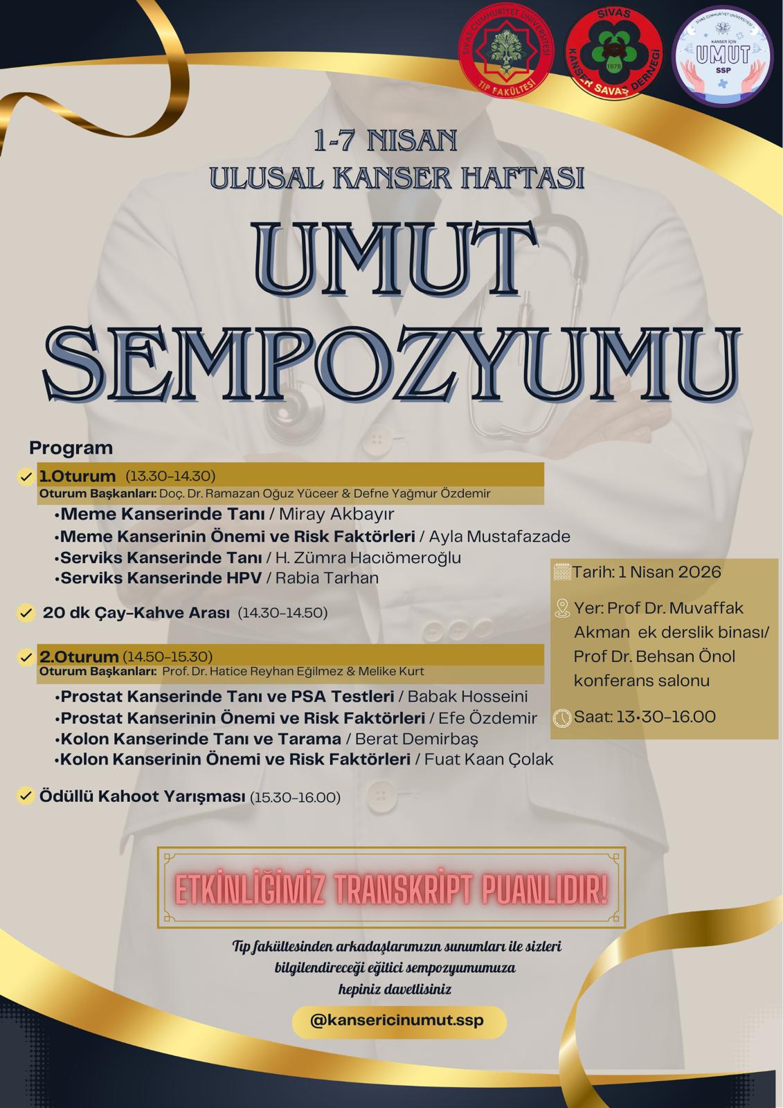 Tıp fakültesi öğrencilerimizin katkılarıyla gerçekleştirilecek bu sempozyumda; meme, serviks, prostat ve kolon kanserleri başta olmak üzere, kanserde erken tanı, risk faktörleri ve güncel yaklaşımlar ele alınacaktır.